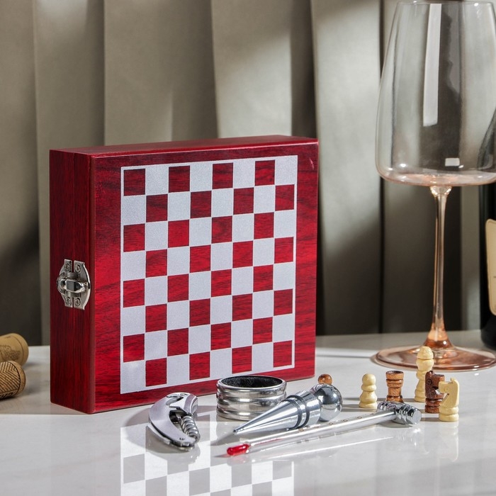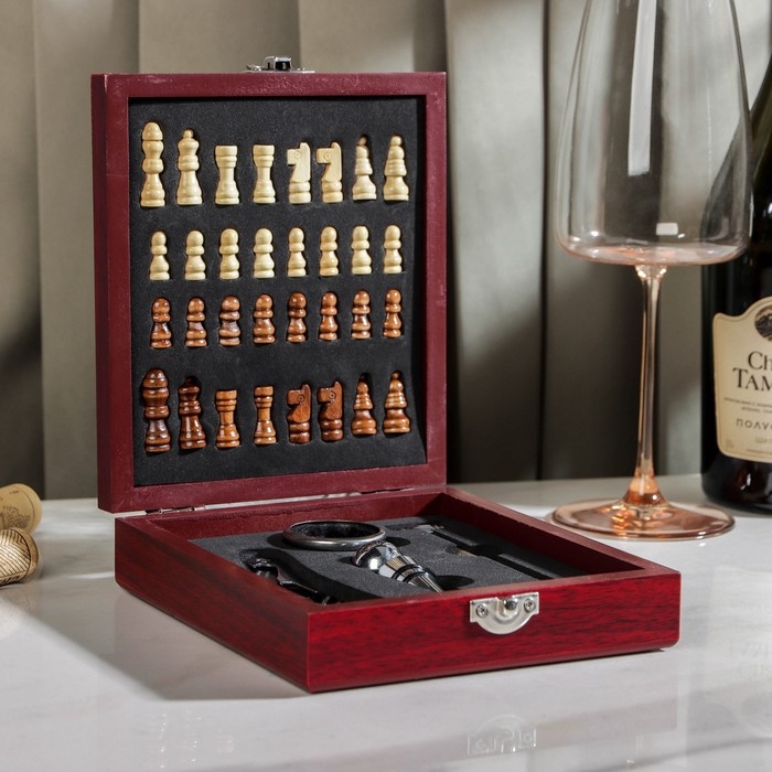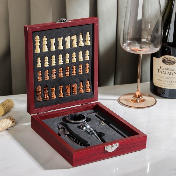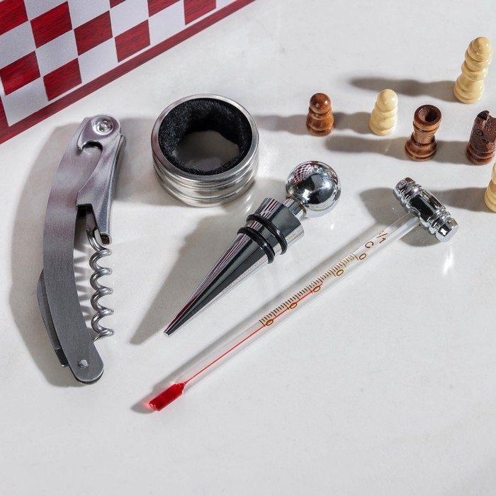 Набор для вина Доляна, 4 предмета: термометр, кольцо, открывашка, пробка, шахматы в комплекте