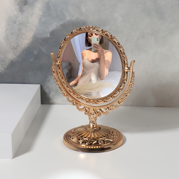 Изящное зеркало на ножке — украшение для туалетного столика. Конструкция не расшатывается и устойчиво держится на поверхности. Увеличивающая линза пригодится, чтобы рассмотреть детали макияжа.