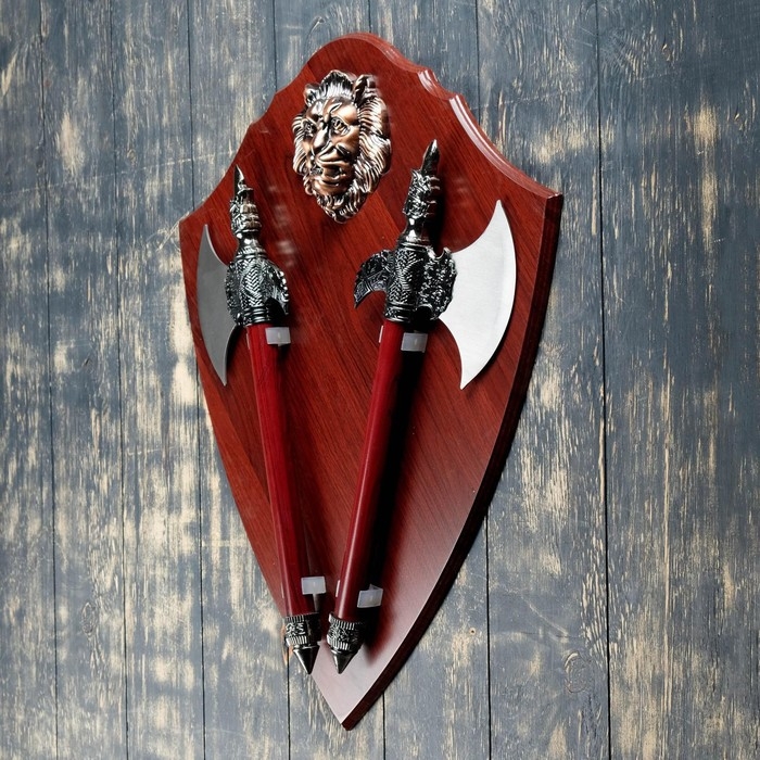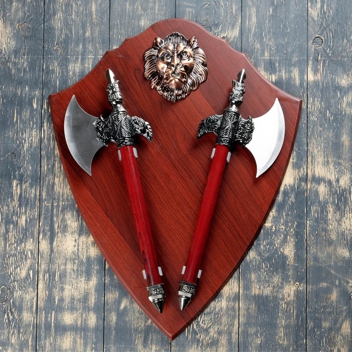 Сувенирное оружие " Топоры с когтем" на планшете со львом, 46х60 см изысканный интерьерный декор, придется по вкусу мужчине, для которого гордость и достоинство - верные спутники в жизни. Геральдическая символика и витиеватые узоры, изображенные на оружии, отбрасывают нас в далекую эпоху средневековья.