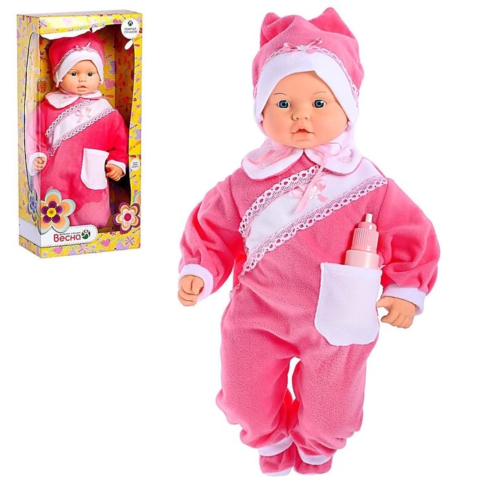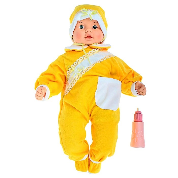Девочка всегда сможет поделиться с новой подружкой своими секретами, ведь она лучше других умеет их хранить! А ещё, мягконабивную куклу можно брать с собой в кроватку и спать с ней в обнимку, как с плюшевой игрушкой. Звуковой модуль находится в бутылочке, которая имеется в комплекте с куклой. Если поднести бутылочку ко рту куклы и нажать на неё, то послышится звук плача ребёнка, звук сосания из бутылочки, радостный смех и слоги «ма-ма».