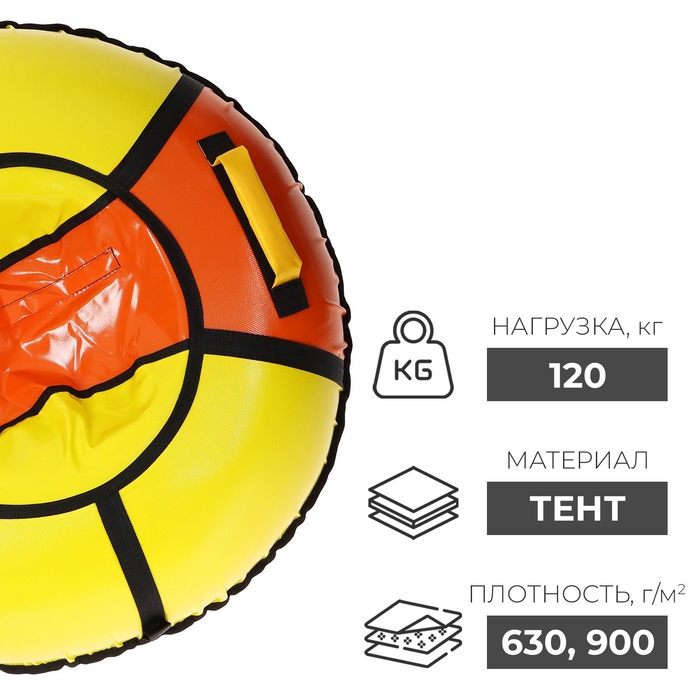 Дно тюбинга изготовлено из тентовой ткани ПВХ 900 г/м², что гарантирует долгий срок службы и обеспечивает отличное скольжение. Тюбинг оснащён безопасными ручками и молнией для быстрого доступа к камере. Имеет закрытую сердцевину, что исключает попадание снега внутрь. Фактический размер накачанного тюбинга зависит от температуры внешней среды и давления в камере. Для тюбинга подойдёт камера 14 дюймов. Предназначен для детей от 3 лет.