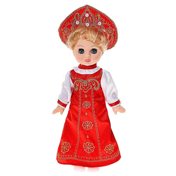 «Эля — русская красавица» из серии «Этно» одета в национальный костюм. На ней красный сарафан с золотым узором, на ногах аккуратные белые туфли. А завершает образ кокошник с витиеватым русским орнаментом. Одежда легко снимается и надевается, что позволяет разнообразить игру и менять наряды. Переодевания развивают мелкую моторику рук, творческое мышление и чувство стиля.