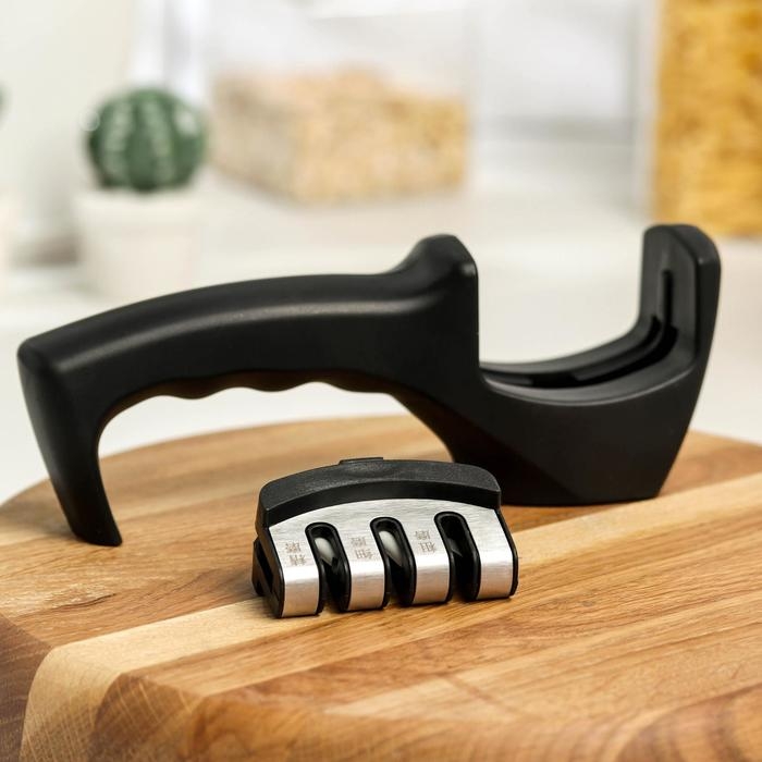 Точилка для ножей выполнена из высококачественных материалов. Она имеет 3 слота для заточки и правки ножей, а также нескользящее основание.
