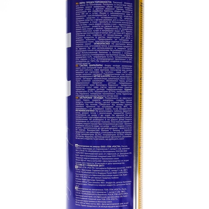 Универсальный аэрозоль Rubit - инсектицидное средство для уничтожения в помещениях летающих и нелетающих насекомых: мух, комаров, москитов, бабочек, моли, ос, а также тараканов, блох, клопов, муравьев и кожеедов.Преимущества:Быстродействующий;Универсальный;Длительный срок хранения;Без запаха.Предназначено для уничтожения в помещениях летающих и нелетающих насекомых. Действующее вещество - циперметрин, тетраметрин, пиперонилбутоксид.Внимание! Хранить отдельно от лекарств, пищевых продуктов и кормов для животных в сухом, прохладном месте, недоступном для детей и животных.Составциперметрин, тетраметрин, пиперонилбутоксид