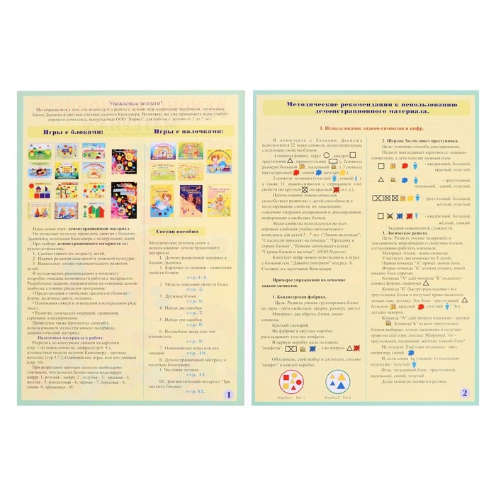 Демонстрационный материал – это методическое наглядное пособие, позволяющее педагогу проводить развивающие занятия с блоками Дьенеша и палочками Кюизенера у группы детей от 2 до 7 лет.