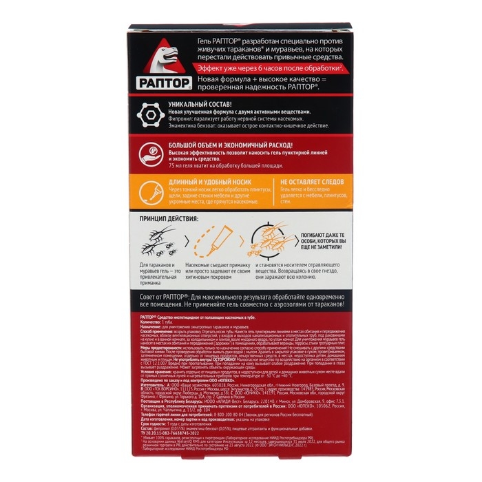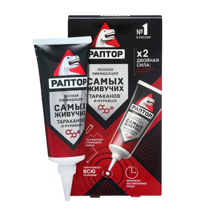РАПТОР избавит вас от нежелательных соседей, наводнивших вашу квартиру, а заодно и от чувства неловкости перед гостями, заметившими, что они не единственные гости в вашем доме...Нанесите гель пунктирной или сплошной линией в местах массового обитания и передвижения насекомых. Он не имеет запаха, не растекается и не оставляет следов на поверхности. Удобный удлинённый носик тубы позволит вам добраться до самых труднодоступных укрытий - за плинтусами, под неплотно прилегающими к стене обоями, в трещинах и зазорах в напольных покрытиях.В состав средства входит два современных действующих вещества широкого спектра, работающих по "принципу домино”: через 24 часа после первого контакта насекомого с гелем начинается массовое вымирание всей популяции. Благодаря своей уникальной консистенции гель долго не высыхает, обеспечивая надёжную защиту от насекомых в течение 6 месяцев! ВАЖНО! Не рекомендуется одновременное использование аэрозоля и гелевого средства от тараканов и муравьёв, поскольку аэрозоль отпугивает насекомых от геля. Раптор-эффект: насекомых нет!Секрет популярности геля РАПТОР от тараканов и муравьев: Профессиональное уничтожение насекомых Действует по «принципу домино» - уничтожается вся популяция. Удобная туба с удлиненным носиком-аппликатором. Не оставляет следов на поверхности после высыхания. До 6 месяцев эффективного действия.В комплект входит Гель Раптор от тараканов и муравьев 75 мл х 2 шт.Составлямбда-цигалотрин - 0,1%; стабилизатор, консервант, гелеобразователь, битрекс, вода и пищевые атрактанты