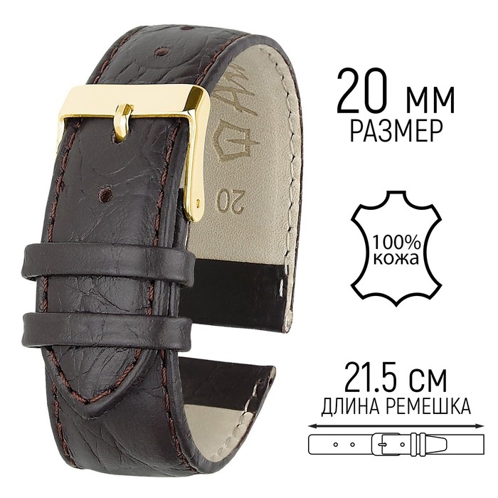 Ремешок для часов, мужской, 20 мм, запряжник 75 мм, горт 115 мм, натуральная кожа, тёмно-коричневый