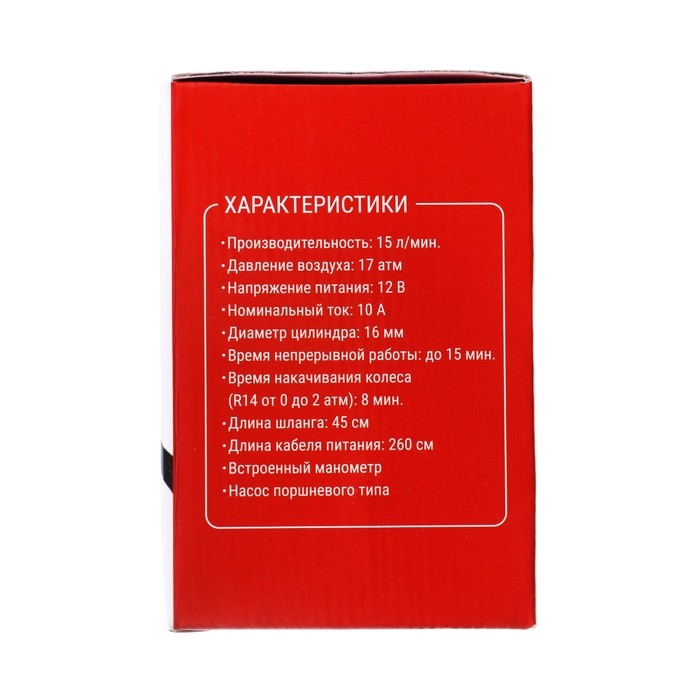 Компрессор автомобильный 15 л/мин, провод 2.6 м, шланг 45 см, 3 переходника