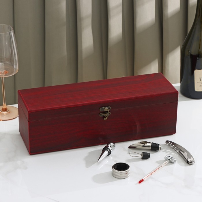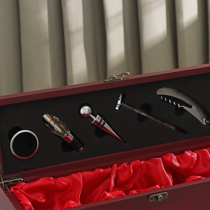 Набор для вина в кейсе Доляна «Бутылка», 5 предметов: пробка, кольцо, каплеуловитель, штопор, нож для срезания фольги