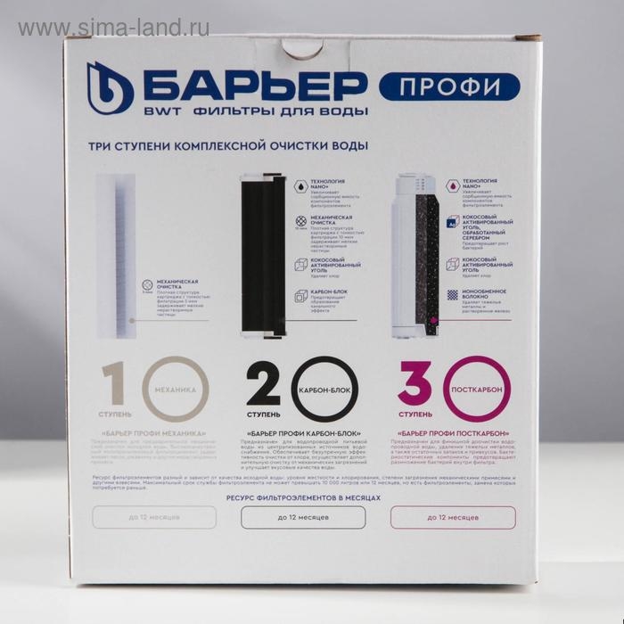 Комплект картриджей для фильтра «Барьер. Профи Стандарт» надёжно защищает от крупных механических частиц, активного хлора, ионов тяжёлых и токсических металлов. Финальная ступень устраняет неприятные запахи и привкусы воды.