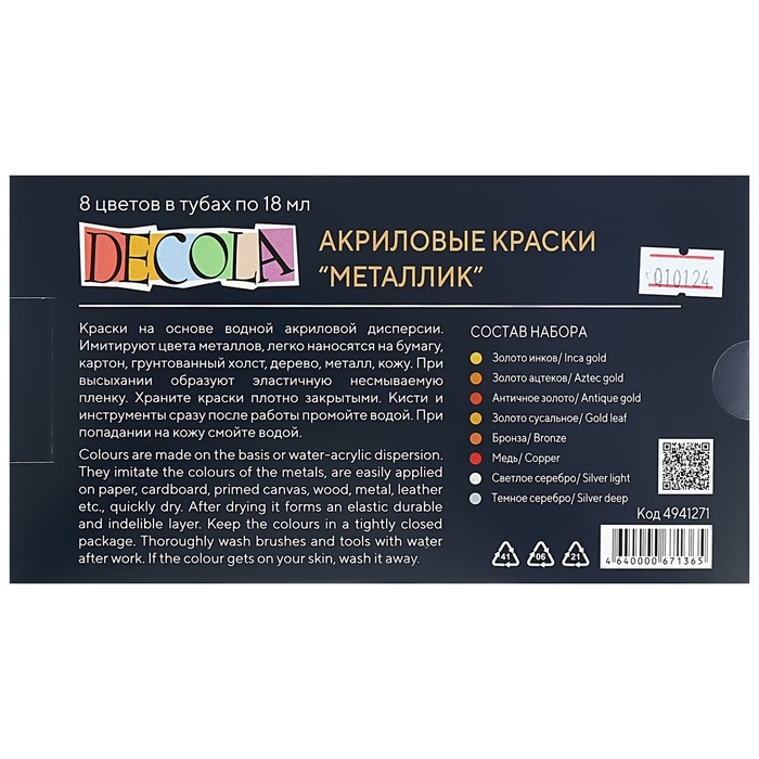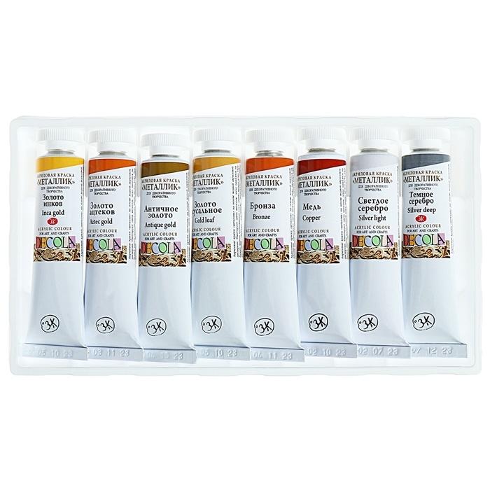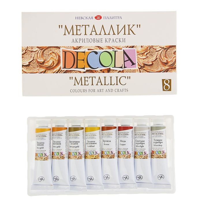 Краска акриловая в тубе, набор 8 цветов х 18 мл, Metallic, ЗХК Decola, металлизированные, в тубе, 4941271