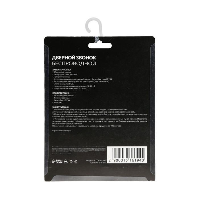 Звонок Luazon LZDV-02-02, беспроводной, 2 кнопки, 2хAА (не в комплекте), LR23A
