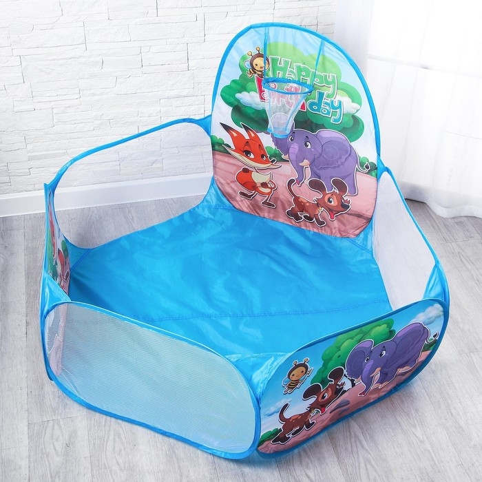 Бассейн оснащён специальной корзиной, в которую малыш будет бросать мячики. Благодаря небольшому весу конструкции палатку без усилий можно передвигать — с этим справится даже ребёнок.