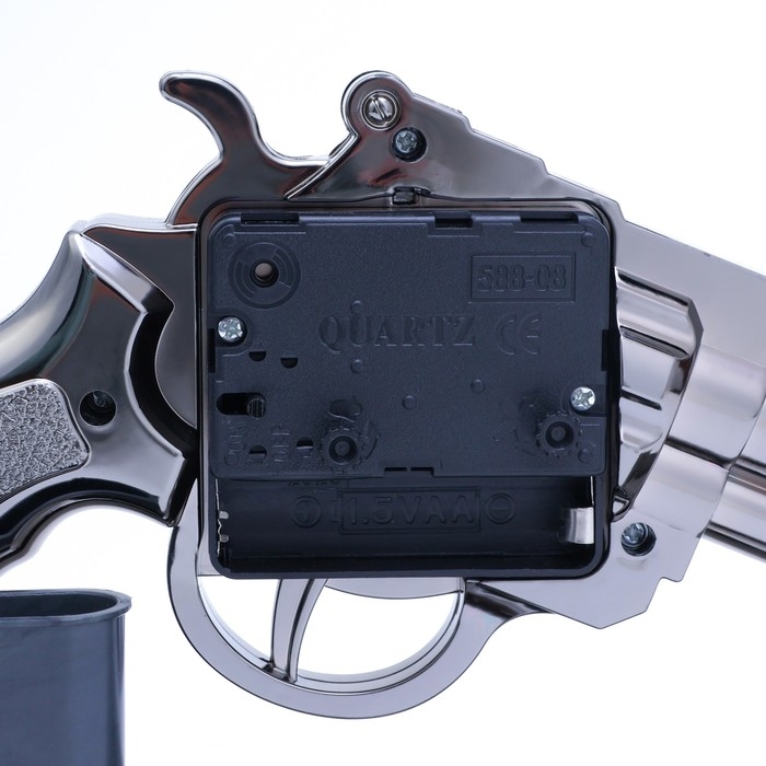 Часы с будильником представлены в оригинальном дизайне в форме револьвера, они отлично впишутся в интерьер. Интерьерные часы станут прекрасным декором для дома и дачи, их можно поставить как на прикроватную тумбочку в спальне, детской комнате, гостиной так и на стол или на комод в зале, холле или на кухне. Будильник настольный имеет кварцевый механизм, который гарантирует высокую точность хода. Часы настольные обладают громким будильником, ребенку и вам будет комфортно просыпаться, на работу и в школу. Будильник на батарейках не требует частой замены батареек благодаря экономичному механизму.