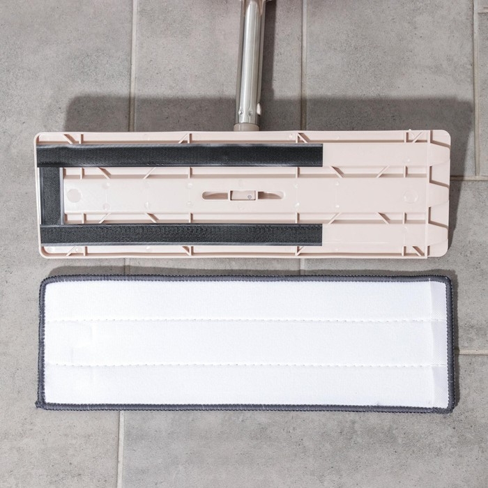 Швабра отлично отмывает любые поверхности. Её насадка сделана из синтетического волокна — микрофибры. Этот материал, в отличие от натурального хлопка, лучше споласкивается, быстро сохнет и препятствует размножению бактерий. Насадка легко снимается одним движением руки.
