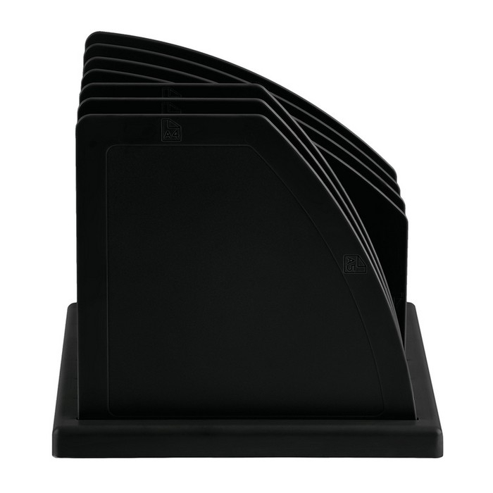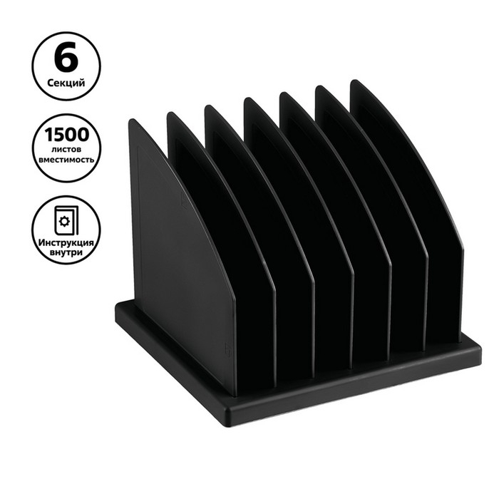 Лоток-сортер 6 отделений для бумаг форматов А4, А5. Современный дизайн, быстрая и легкая сборка. Возможна установка перегородок в вертикальном и горизонтальном положениях. Удобная конструкция предусматривает регулировку ширины отделений. Изготовлен из качественного полистирола. Упакован в термоусадочную пленку, поставляется в разобранном виде. Инструкция по сборке в комплекте. Цвет лотка - черный
