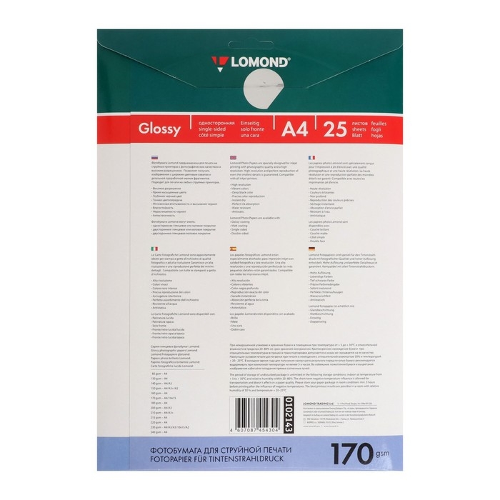 Фотобумага для струйной печати А4, 25 листов LOMOND, 170 г/м2, односторонняя, глянцевая