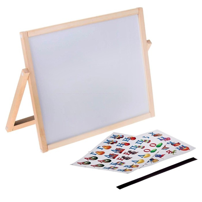 Двухсторонняя доска понравится юным художникам и любителям творчества. Она предназначена для рисования водным маркером и выкладывания слов из букв, фигурок из мозаики или выполнения математических действий. Магнитные элементы не входят в комплект, их можно приобрести отдельно.