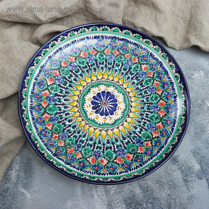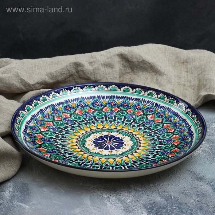 Ляган круглый «Риштан», 36 см, зелёный, орнамент бело-синий