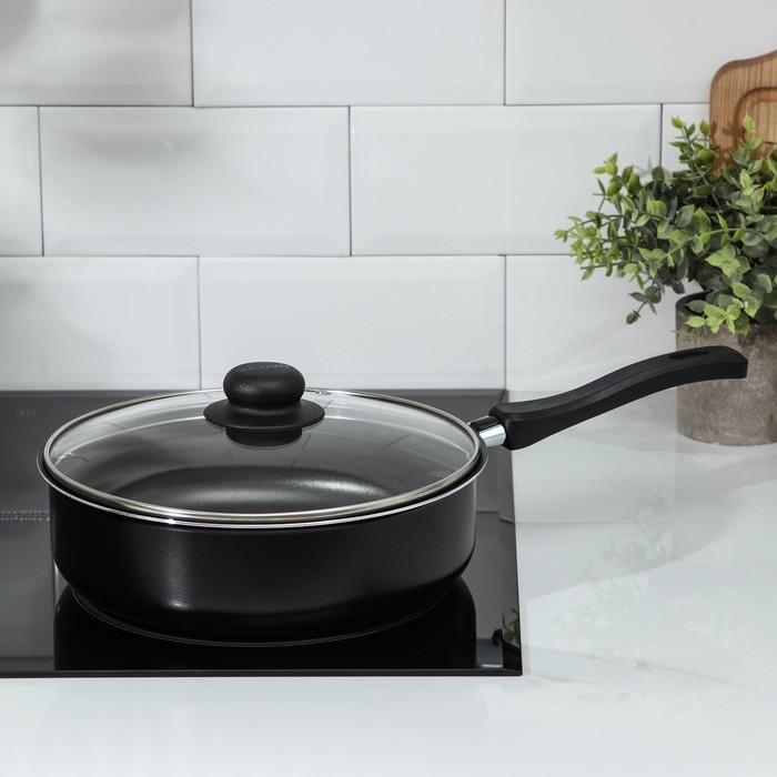 Сотейник Promo, 2,8 л, d=24 см, стеклянная крышка, пластиковая ручка, антипригарное покрытие, цвет чёрный