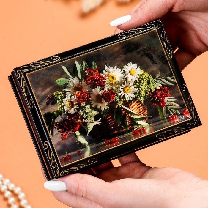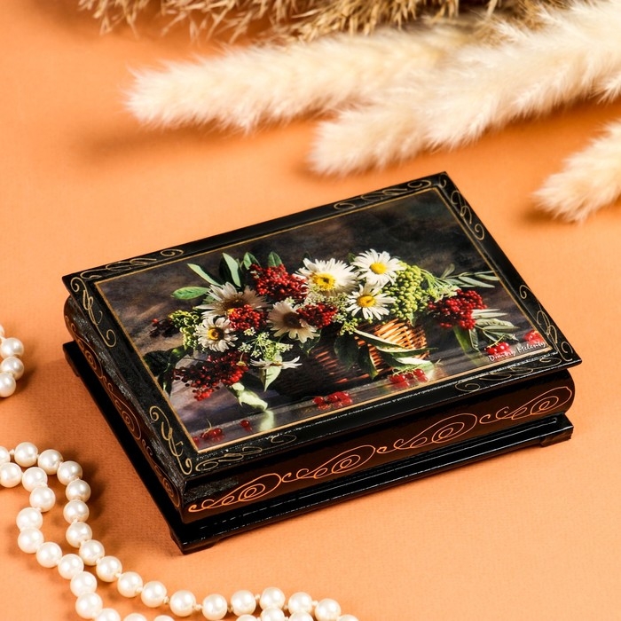 Шкатулка «Ромашки с ягодами в корзине», 10×14 см, лаковая миниатюра