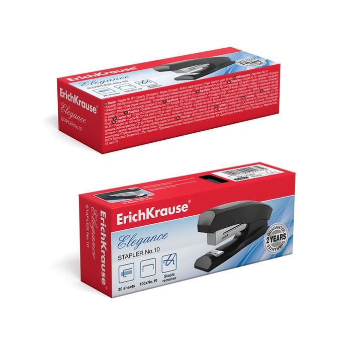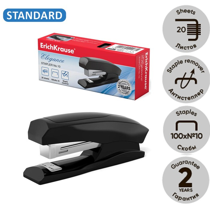 Степлер ErichKrause Elegance № 10, до 20 листов, встроенный антистеплер, чёрный