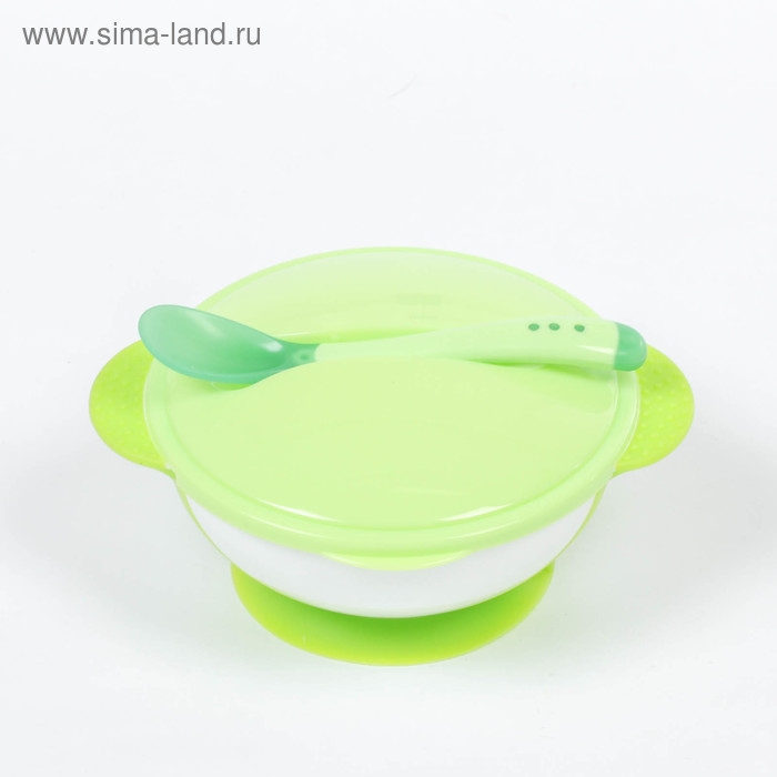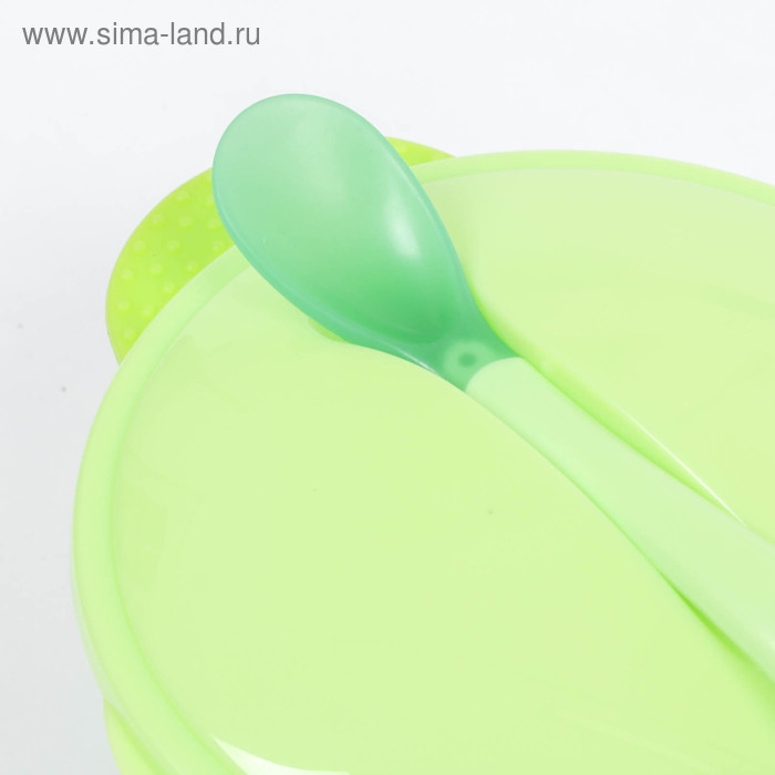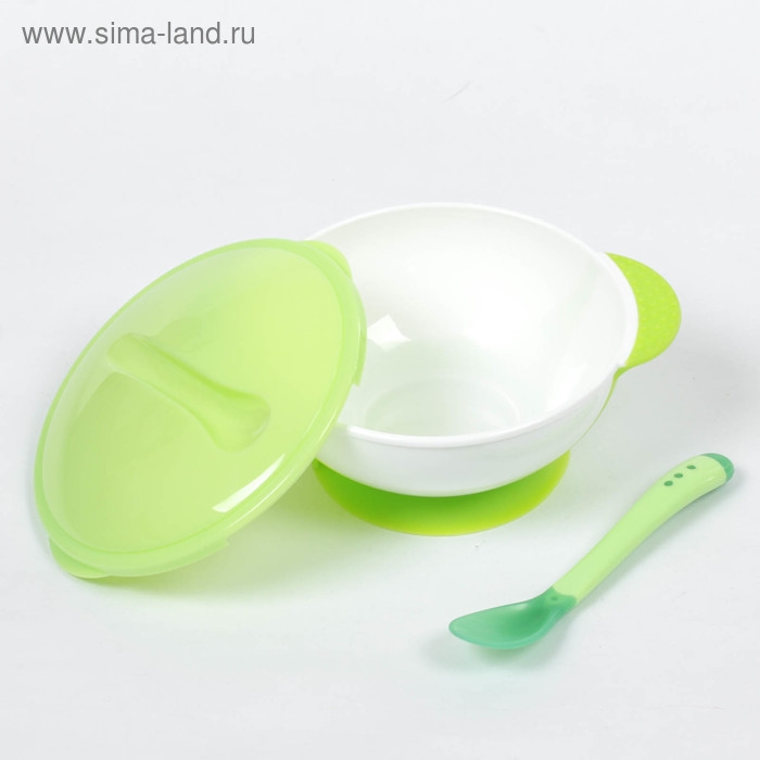 Набор для кормления, 3 предмета: миска 350 мл на присоске, крышка, ложка, цвет зелёный