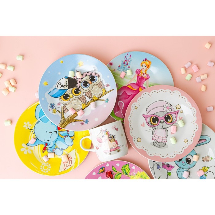 Набор детской посуды из керамики Доляна «Единорожка», 3 предмета: кружка 230 мл, миска 400 мл, тарелка d=18 см