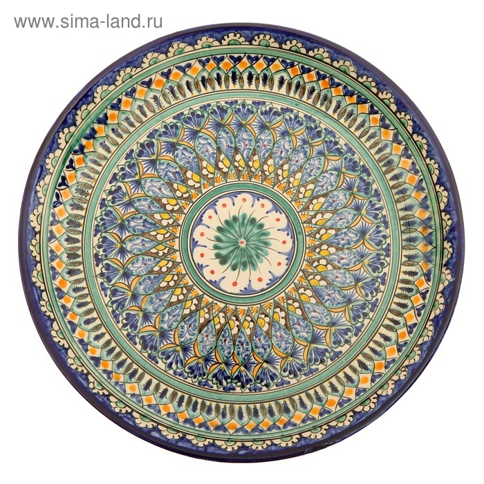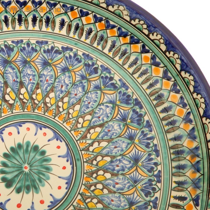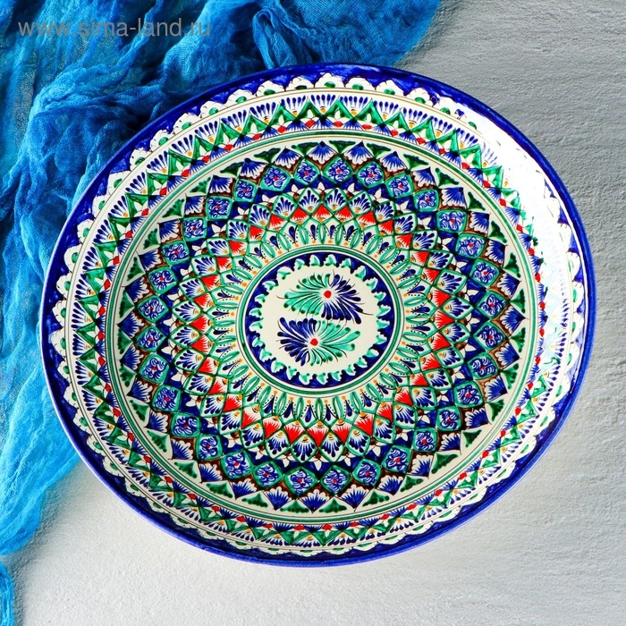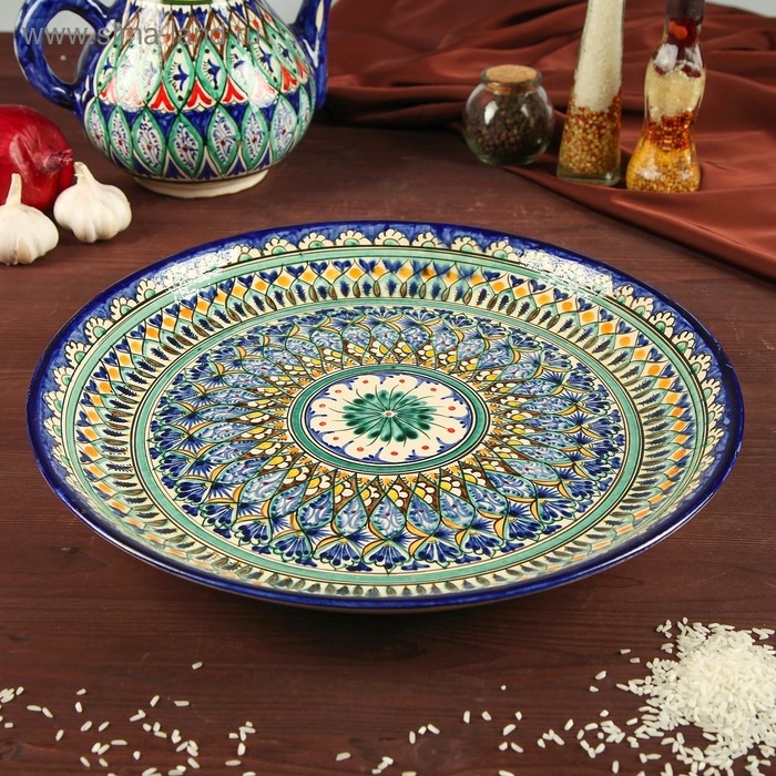 Ляган круглый «Риштан», 36 см, зелёный, орнамент бело-синий