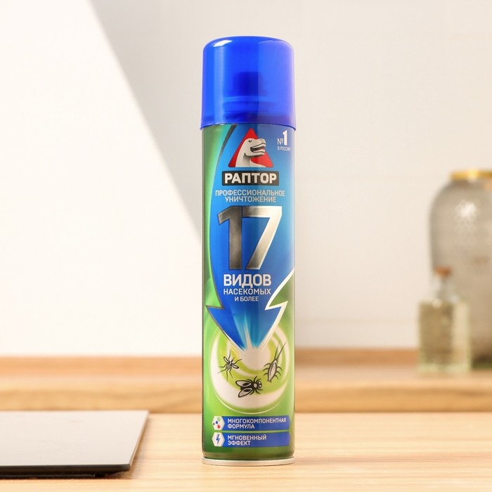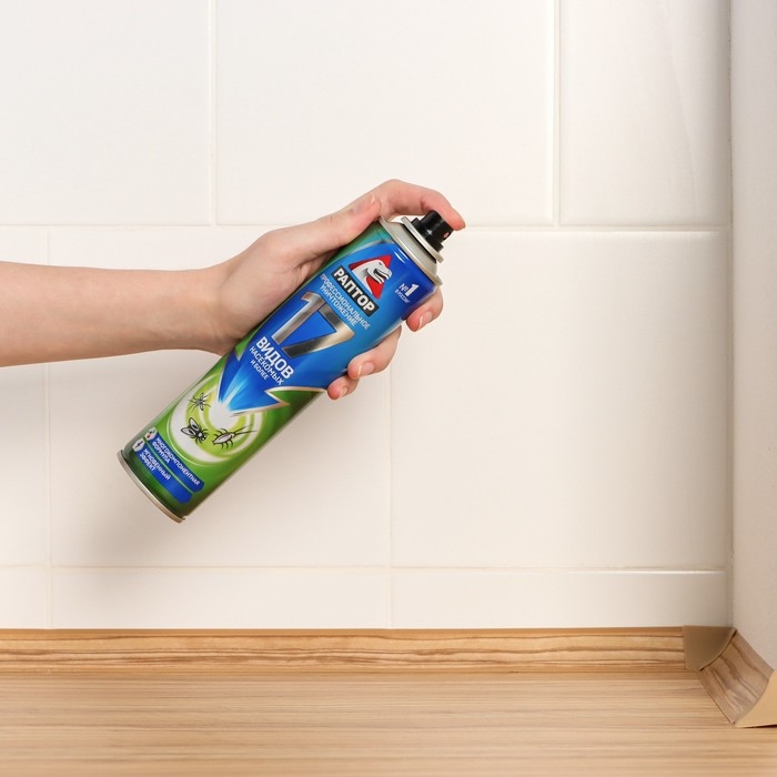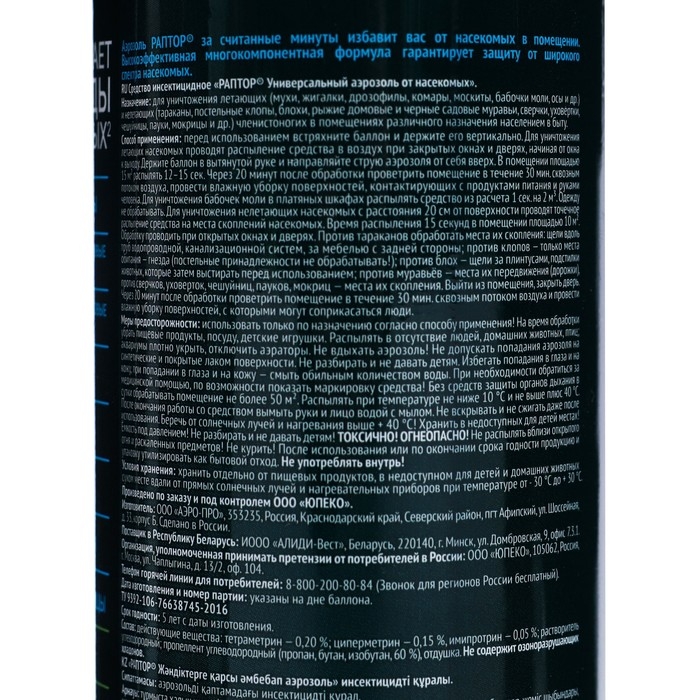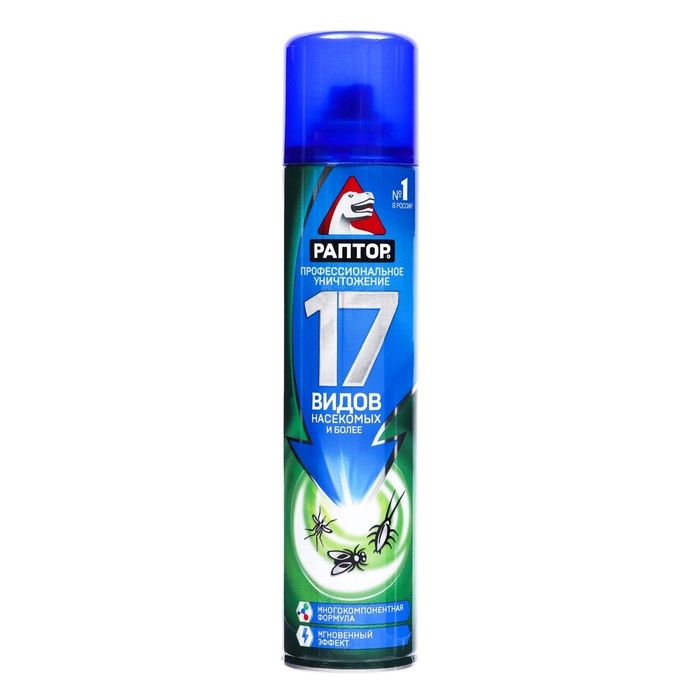 Универсальный аэрозоль Раптор – эффективное средство защиты от семнадцати видов ползающих и летающих насекомых. Благодаря трем сильным инсектицидам в составе оно не дает возможности для вредителей адаптироваться и выработать иммунитет, оставаясь одинаково действенным от обработки к обработке. Клопы, блохи, тараканы, мухи, муравьи, осы и пауки надолго покинут ваш дом, если обработать его укромные места спреем Раптор. Мощная струя и широкий охват распылителя позволяет проникнуть препарату в самые труднодоступные места. Средство наносится легко и действует мгновенно. Оно не токсично и не оставляет следов и пятен на поверхностях. Наилучших результатов от применения аэрозоля можно добиться, распыляя средство во всех помещениях, где обнаружены насекомые, одновременно. Повторную обработку для закрепления эффекта следует провести через месяц.Состав Средство отличается уникальным составом, в котором присутствуют три сильнодействующих инсектицида: тетраметрин – 0,20%; циперметрин – 0,15%, имипротрин – 0,05%. Вспомогательными веществами являются: растворитель углеводородный; пропеллент углеводородный (пропан, бутан, изобутан, 60 %), ароматическая отдушка. Спрей не содержит хладонов и озоноразрушающих компонентов.Способ применения Перед применением следует снять защитный пластиковый колпачок, хорошо встряхнуть баллон. Удерживая его вертикально на вытянутой руке, распылите аэрозоль с расстояния в 20 см на места передвижения, скопления или потенциального обитания насекомых. Уделите особое внимание таким зонам: щели в стенах и полу, зазоры за плинтусами и дверными коробками, под подоконниками, задние поверхности мебели, картин, ковры и подстилки для животных, санузлы, мусоропроводы, вентиляционные отверстия, вдоль трубопровода и канализационных труб. Распыляйте в течение 15 секунд. Через 15 минут после обработки помещения, его следует проветрить не менее 30 минут.