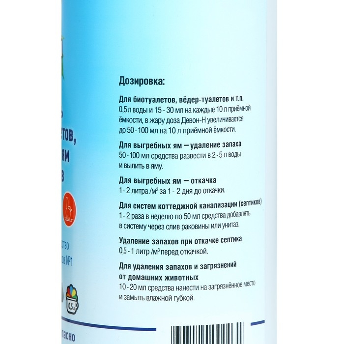 Используйте жидкий концентрат «Девон-Н» в биотуалетах, туалетах с выдвижной бадьёй, в выгребных ямах, вёдрах-туалетах, системах коттеджной канализации, а также для удаления запахов от домашних животных и других неприятных запахов в жилых помещениях.