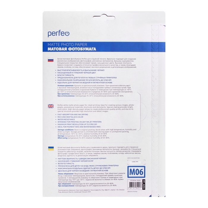 Носитель Perfeo PF-MTA4-190/50 обладает плотностью 190 г/м2, чего достаточно для создания фотографий, сувенирных календарей или поздравительных открыток. Бумага обладает популярным форматом A4, позволяющим печатать одно большое или до 4 стандартных фотографий. Бумага обладает матовым покрытием и поставляется пачками по 50 листов.