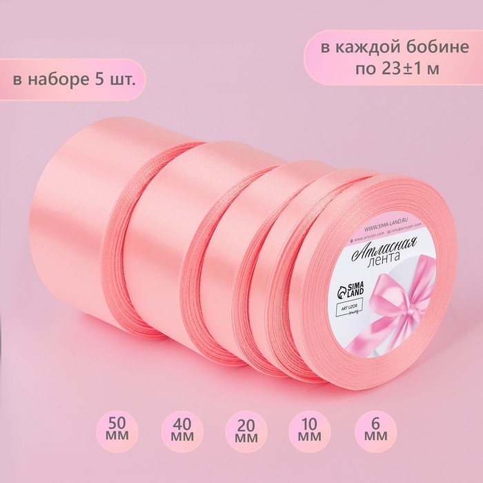 Набор атласных лент, 5 шт, размер лент: 6/10/20/40/50 мм × 23 ± 1 м, цвет розовый