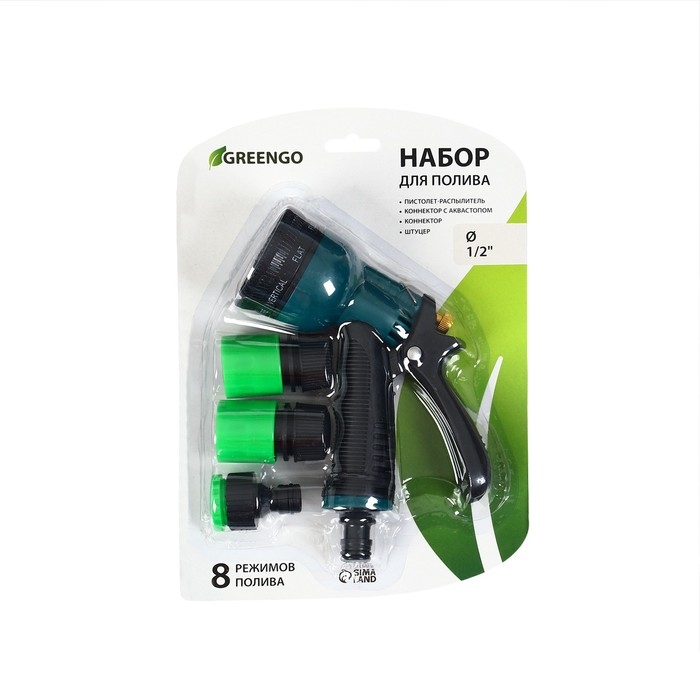 Набор: пистолет-распылитель, коннектор 1/2" (12 мм), коннектор с аквастопом 1/2" (12 мм), пластик, Greengo