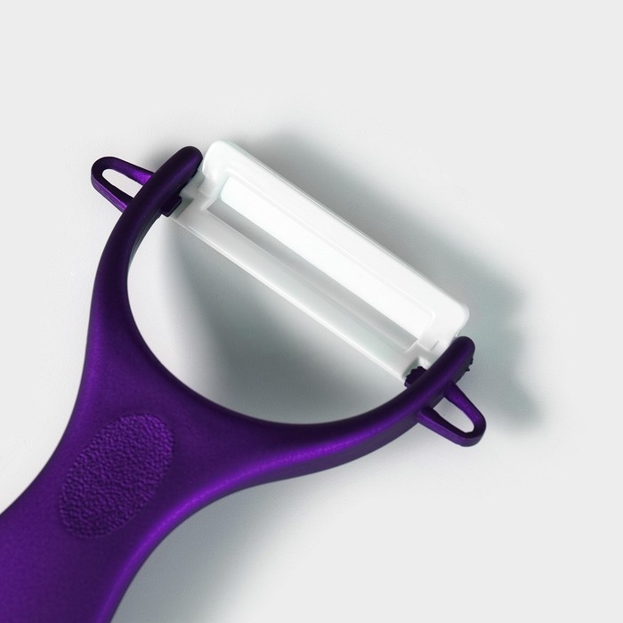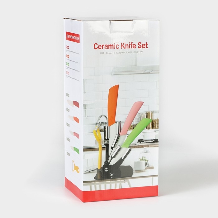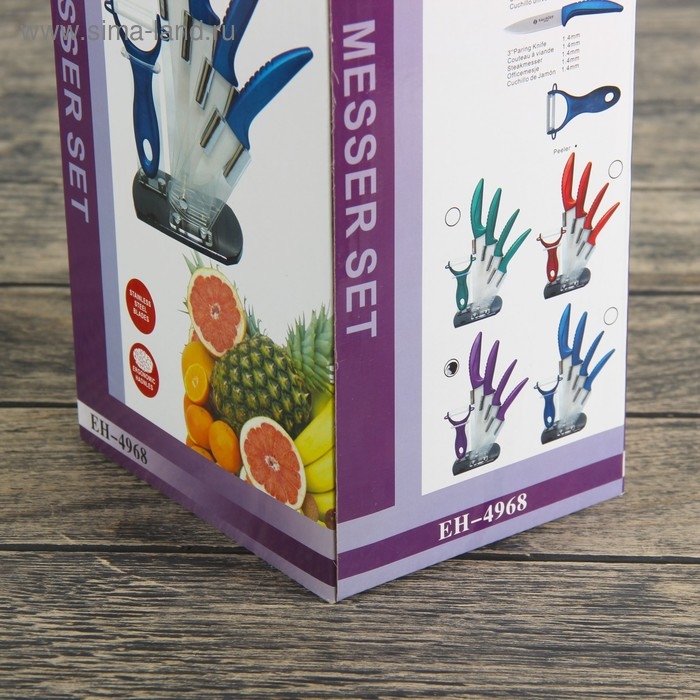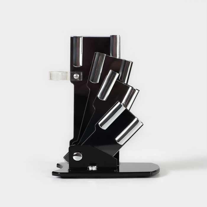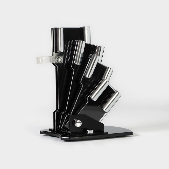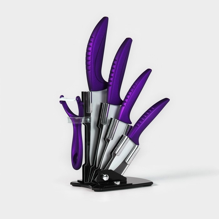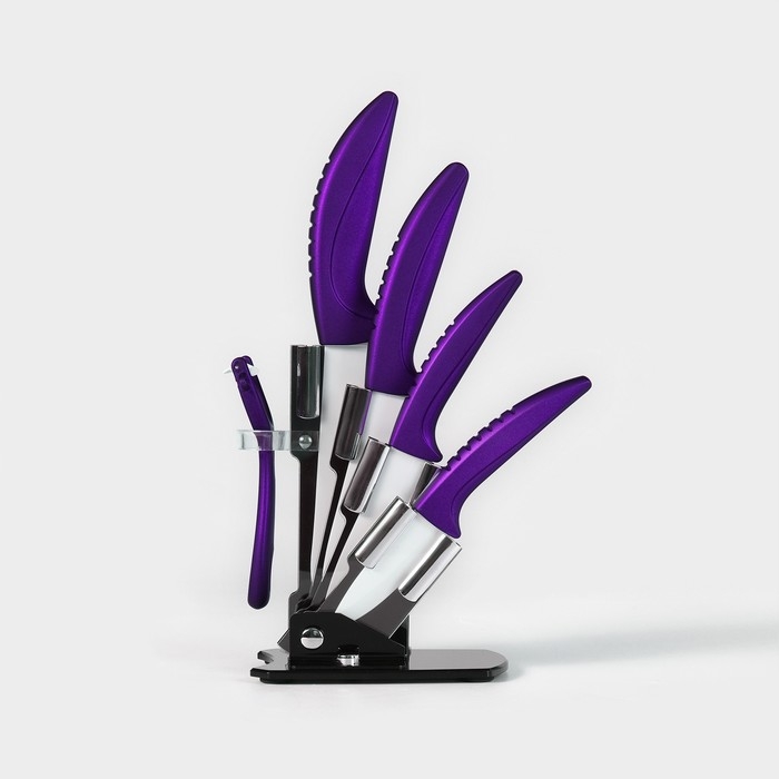 Набор кухонный «Изгиб», 5 предметов: ножи 7,5 см, 10 см, 13 см, 15 см, овощечистка, на подставке, цвет фиолетовый