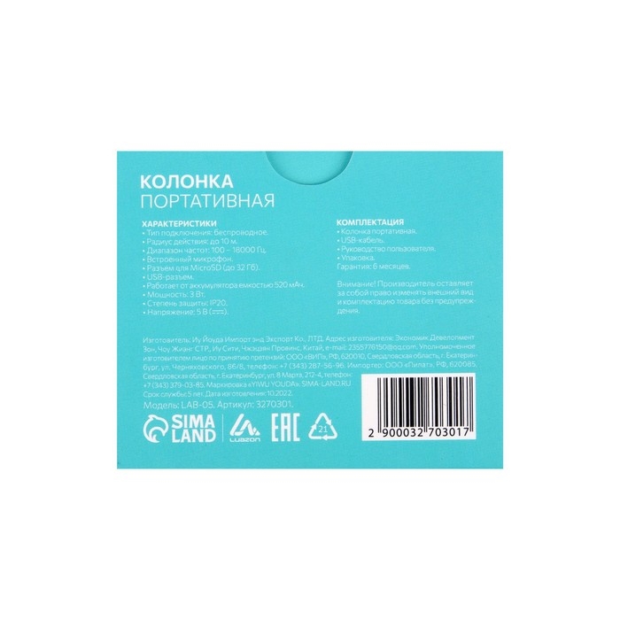 Портативная колонка LuazON LAB-05, 3 Вт, 520 мАч, Bluetooth, USB, microSD, microUSB, МИКС
