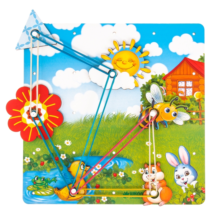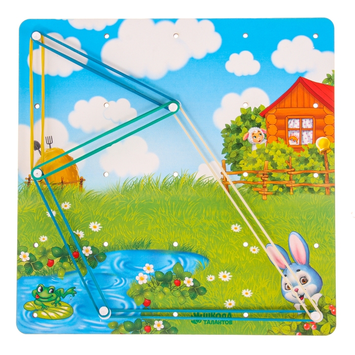 Геоборд представляет собой плоское поле (обычно в форме квадрата или прямоугольника) с равноудалёнными друг от друга штырьками. Суть игры - создавать различные фигуры, надевая на штырьки резиночки. Сначала предложите малышу повторить схемы из набора, а затем попросите придумать историю и обыграть её с помощью резиночек на геоборде.