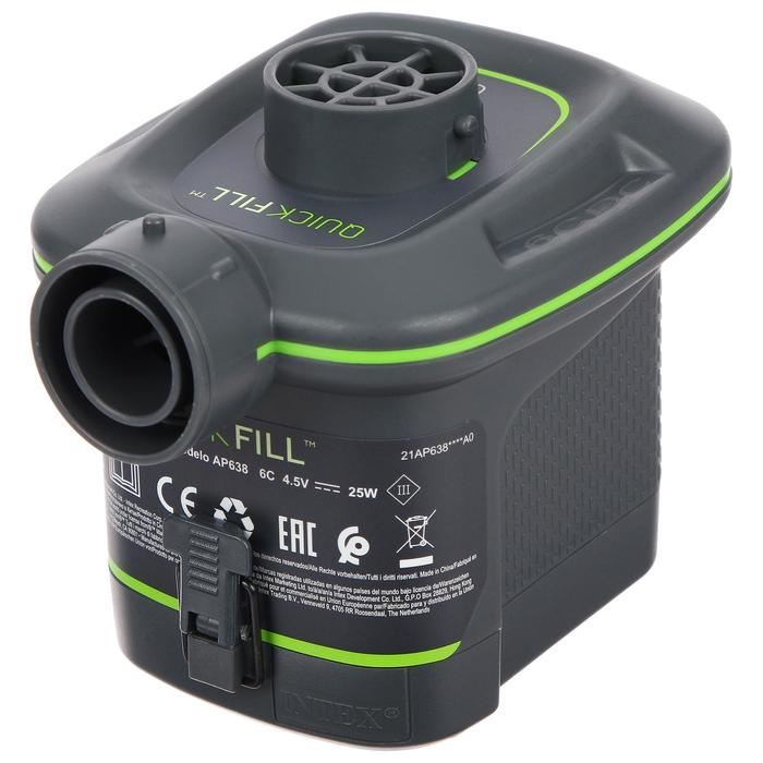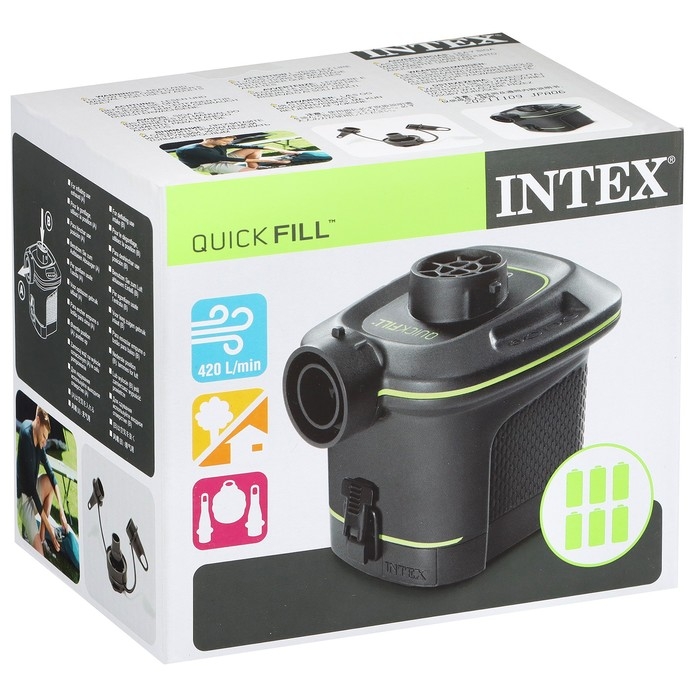 Для работы насоса необходимо 6 шт батареек или аккумуляторов Тип С. При помощи данного насоса можно накачивать или сдувать любые надувные изделия производства Intex. Насос удобно брать с собой в поездки и на природу, где нет электрической сети. В комплекте 3 насадки. Размер: 11 см × 15 см × 13 см. Продуктивность - 420л/мин.