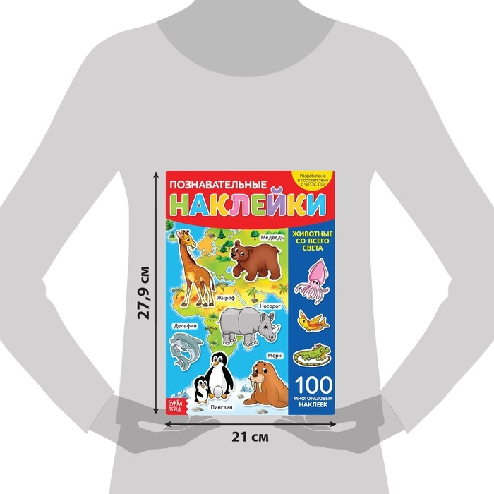 С набором ярких наклеек ребёнок познакомится с животными, которые обитают на разных континентах — на суше и в море, в лесу и на ферме.