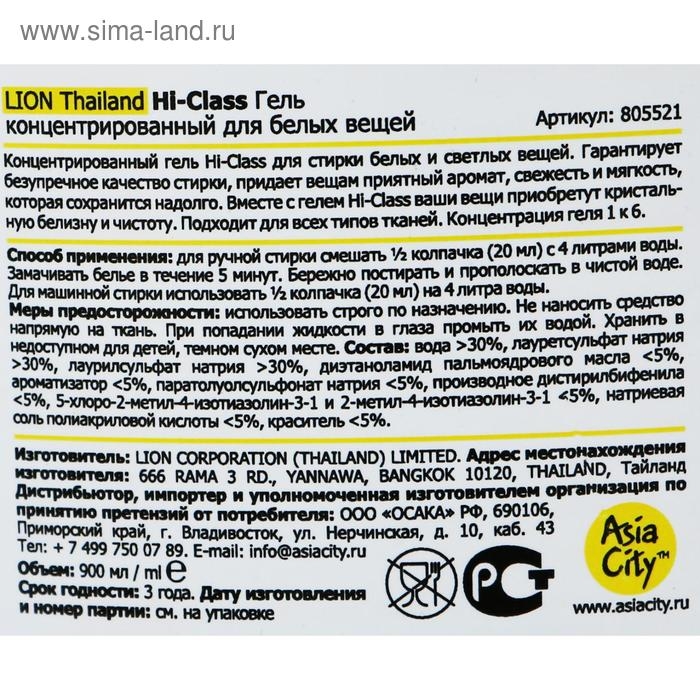 Жидкое средство для стирки Lion Thailand Hi Class, гель, для белых тканей, 900 мл