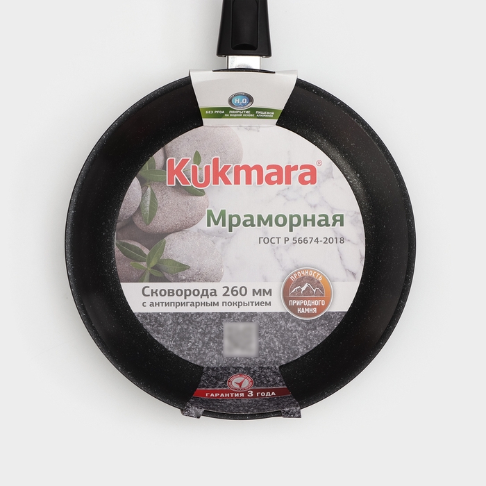Посуда Kukmara «Мраморная» изготовлена из литого алюминия и покрыта инновационным антипригарным мраморным покрытием на водной основе, усиленным сверхтвёрдыми частицами минералов.