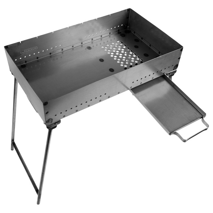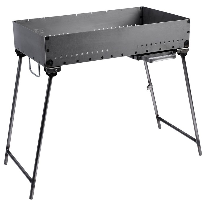 Сборный мангал изготовлен из стали толщиной 1,5 мм и представляет собой металлический короб со складными ножками.