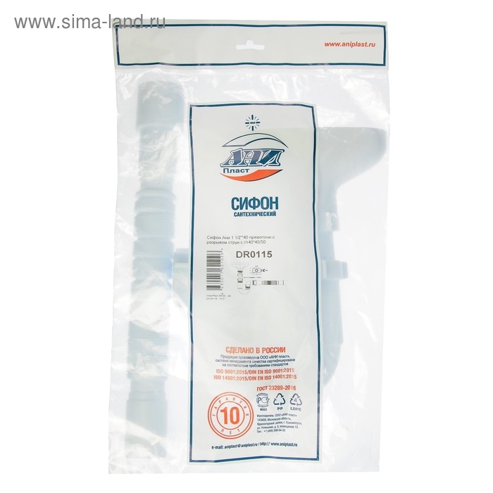 Сифон для мойки "АНИ Пласт" D0110, 1 1/2"х40 мм, прямоточный, с гофрой 40x50 мм