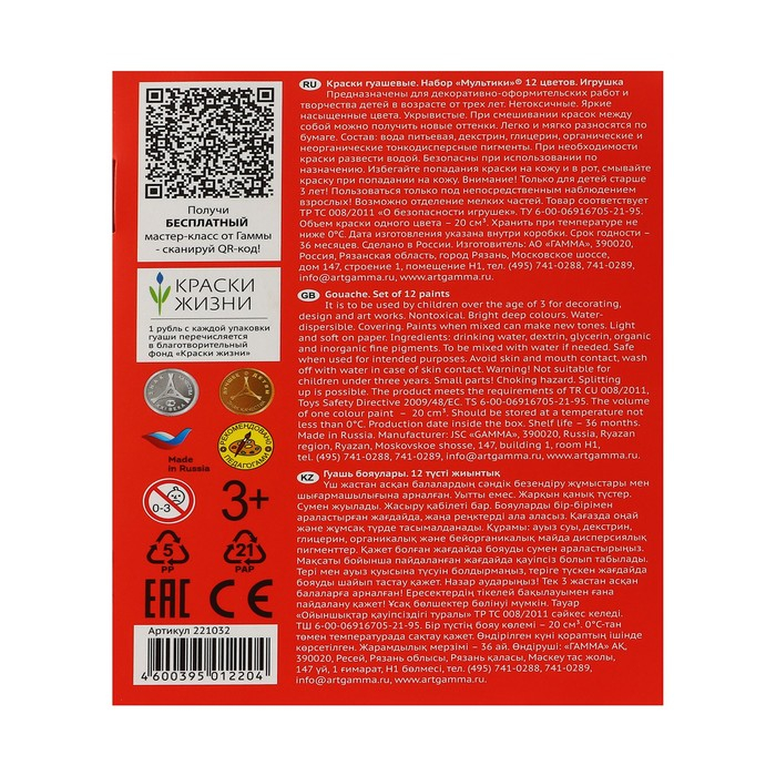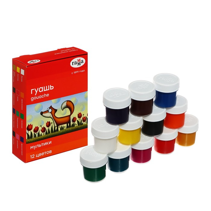 Гуашь 12 цветов по 20 мл Гамма "Мультики", картонная упаковка 221032