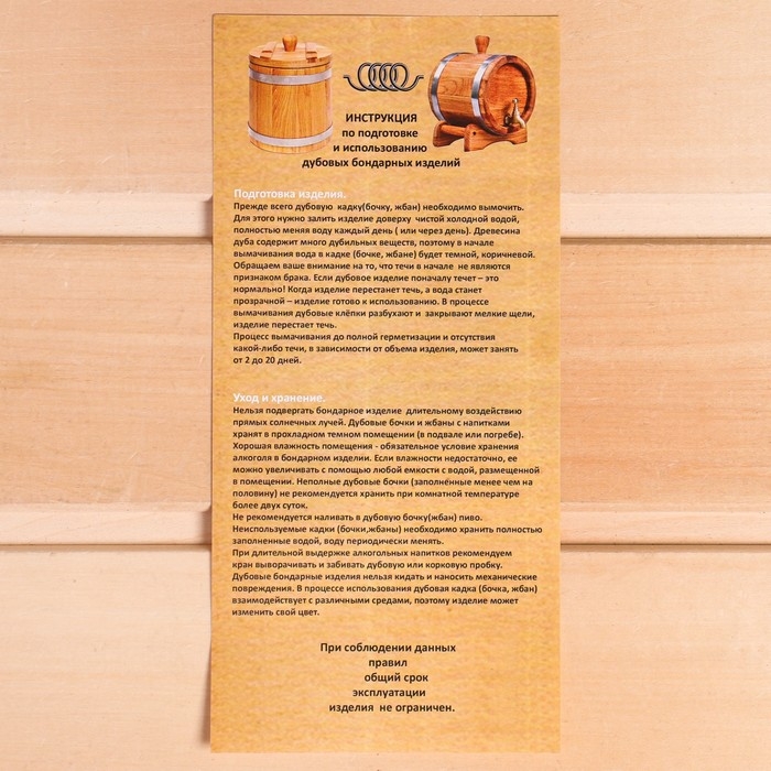 - Перед тем как использовать бондарное изделие впервые, залейте его холодной водой и выдержите 2-3 часа;
