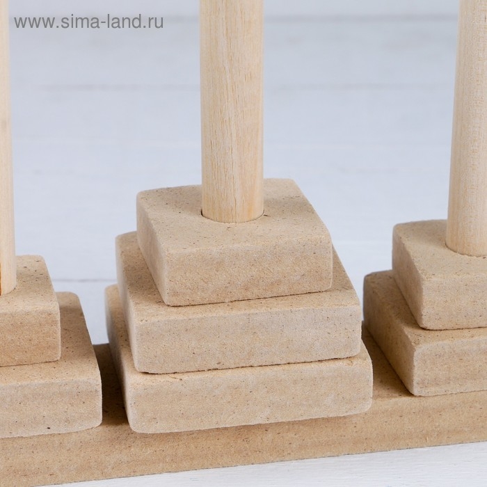 Настольная игра изготовлена из качественных, безопасных материалов. Башня состоит из семи фигур, нанизанных в порядке уменьшения размеров на один из трех колышков. Задача состоит в том, чтобы перенести пирамиду из семи фигур за наименьшее число ходов на другой стержень. За один раз разрешается переносить только одну деталь, причём нельзя класть большую фигуру на меньшую.