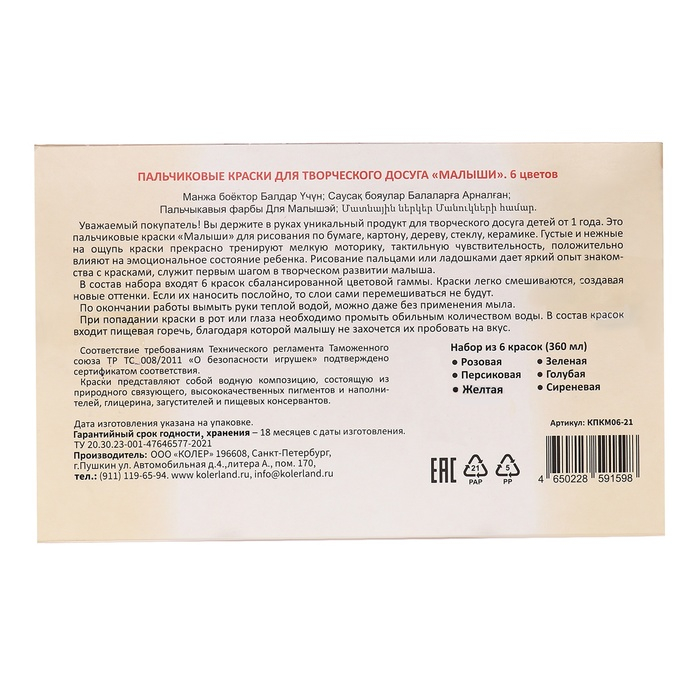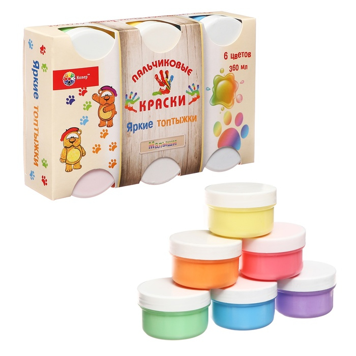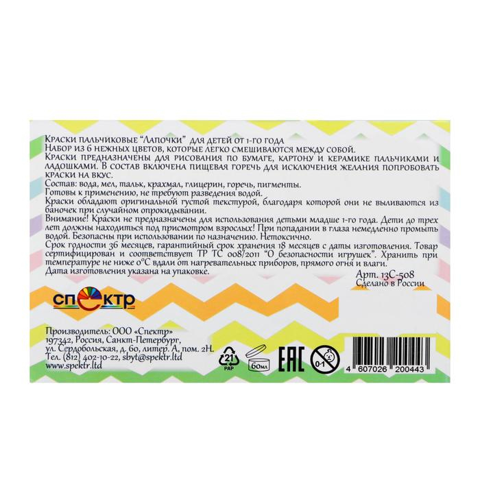 Краски пальчиковые набор 6 цветов х 60 мл, Спектр, 360 мл, "Лапочки" (от 1 года )