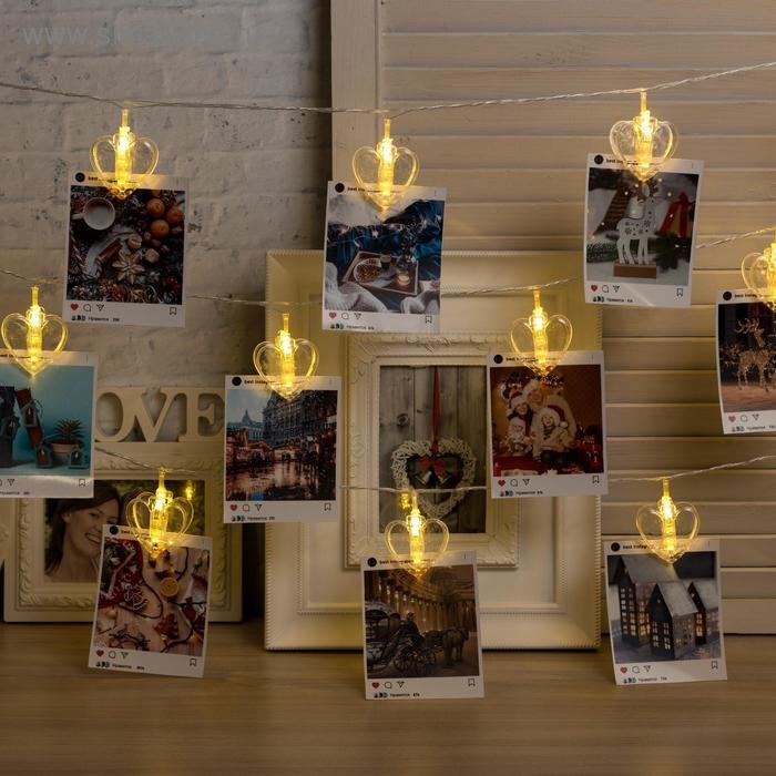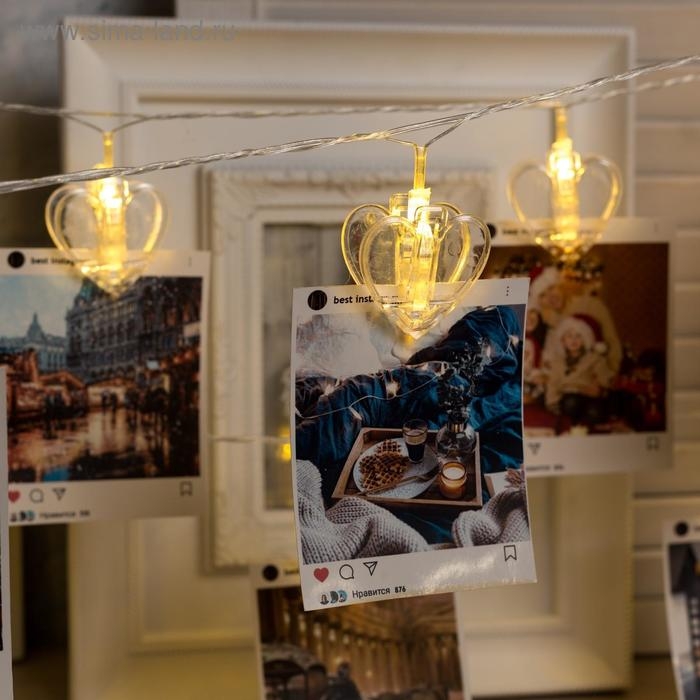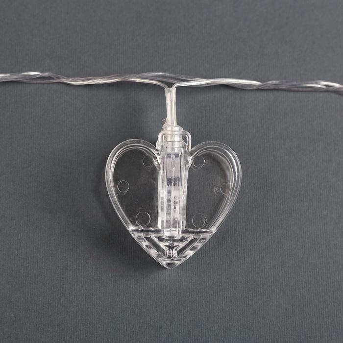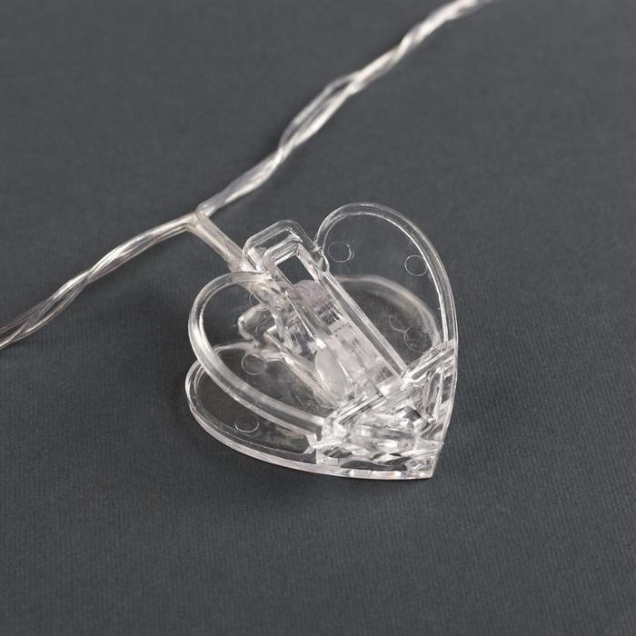 Гирлянда «Нить» 4.5 м с насадками «Прищепки-сердце», IP20, прозрачная нить, 20 LED, свечение тёплое белое, 220 В