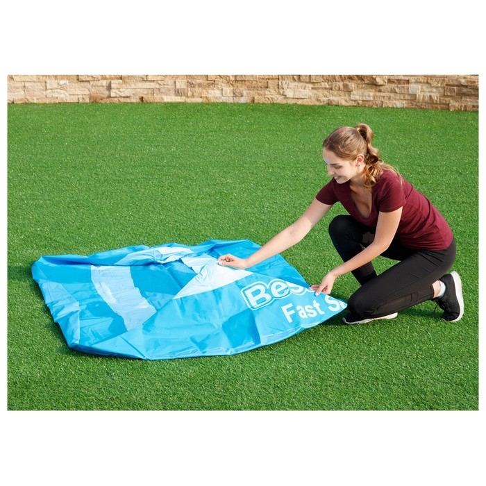 Бассейн быстро и просто устанавливается, благодаря отсутствию металлической конструкции. Время сборки займёт не более 10 минут. Разгладьте все складки на основании, надуйте верхнее кольцо и наполните бассейн водой. По мере заполнения, кольцо поднимается вместе с уровнем воды, расправляя стенки.