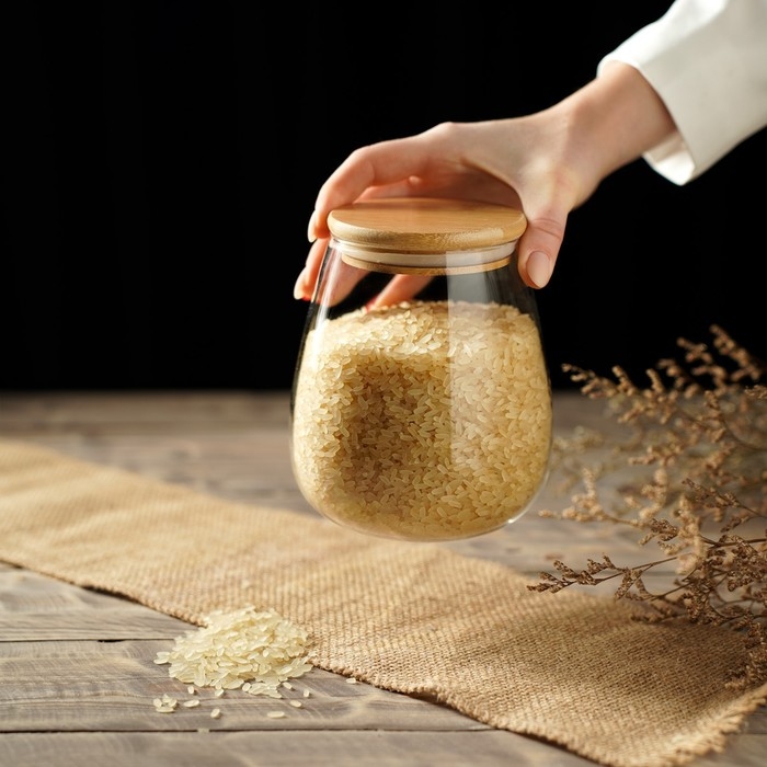 Банка для сыпучих продуктов изготовлена из стекла. Имеет плотно закрывающуюся крышку, которая защищает продукты от влаги и посторонних запахов. В ёмкости удобно хранить крупы, специи, макаронные изделия, сахар, муку и бобовые.